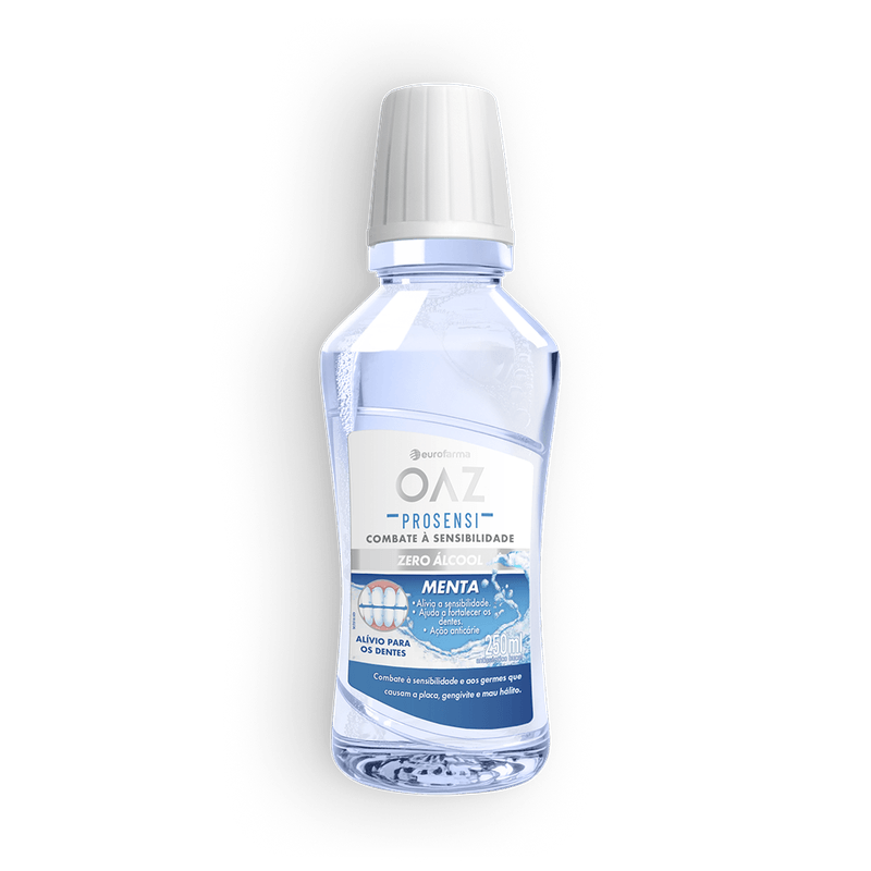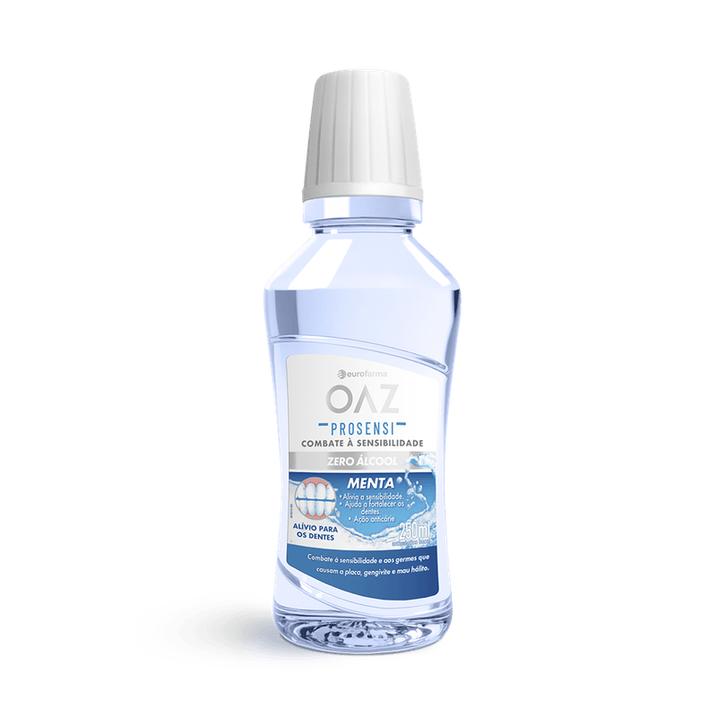 O enxaguante bucal Pro Sensi sabor menta auxilia no combate a sensibilidade, mau halito, germes e fortalece os dentes.