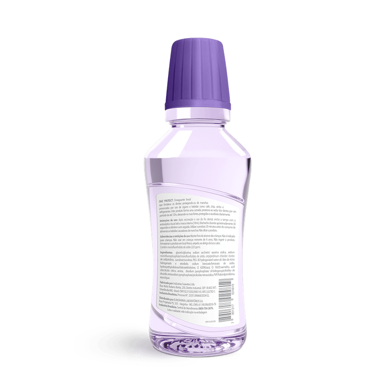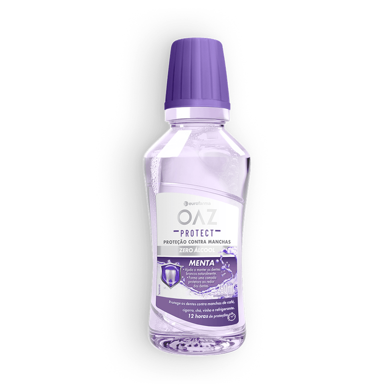 O enxaguante bucal OAZ que oferece 12 horas de proteção contra manchas. Sabor menta, sem álcool.