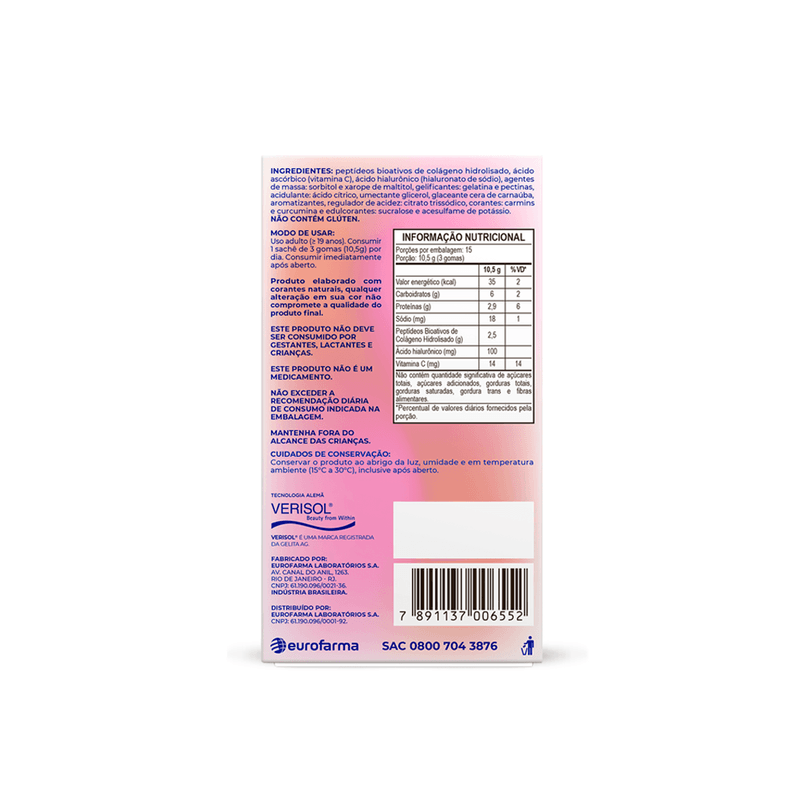 Gomas mastigáveis, sem açúcar e com sabores sortidos: morango e pêssego.INGREDIENTES: Colágeno hidrolisado, ácido hialurônico (hialuronato de sódio), ácido ascórbico (vitamina C), edulcorantes naturais: sorbitol e xarope de maltitol, gelificantes: gelatina e pectina, acidulante: ácido cítrico, umectante: glicerina, glaceante: cera de carnaúba, regulador de acidez: citrato de sódio, aromatizantes, edulcorantes artificiais: sucralose e acesulfame de potássio, corantes naturais: carmim e curcumina.