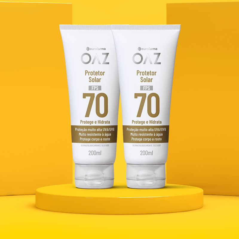 Kit "Protetor Solar 70 FPS" OAZ, que inclui 2 unidades do Protetor Solar OAZ FPS 70 200ml. Ideal para quem busca alta proteção e praticidade, este kit oferece defesa eficaz contra os raios UVA e UVB, garantindo que sua pele esteja sempre protegida e saudável, seja na praia, na piscina ou no dia a dia.