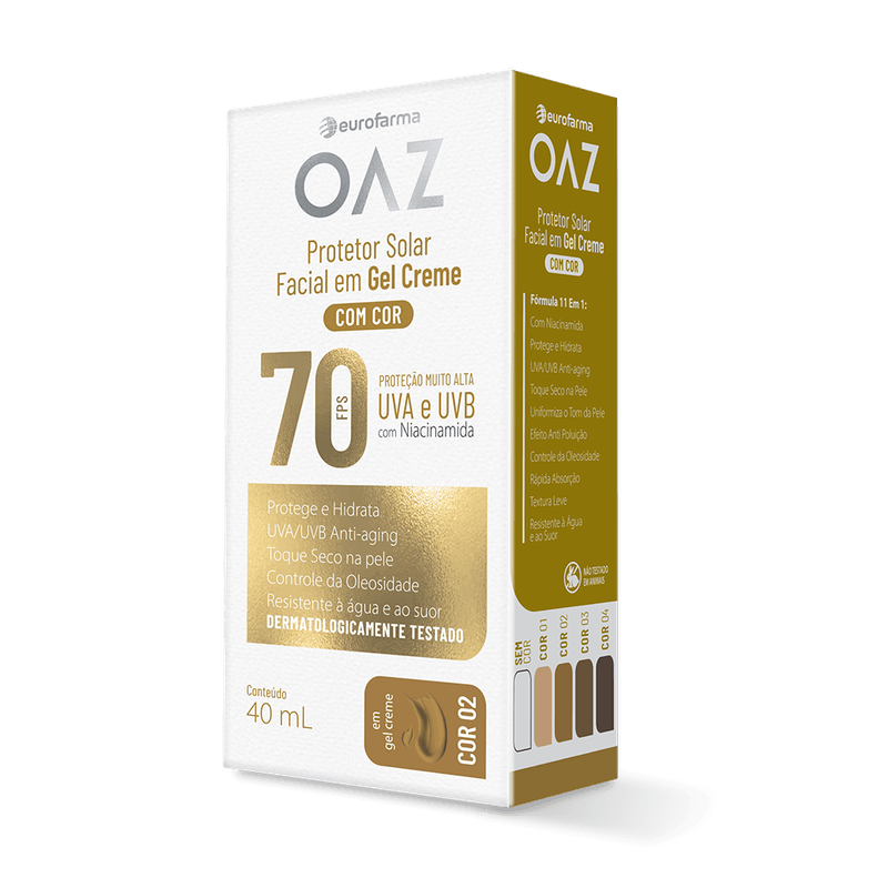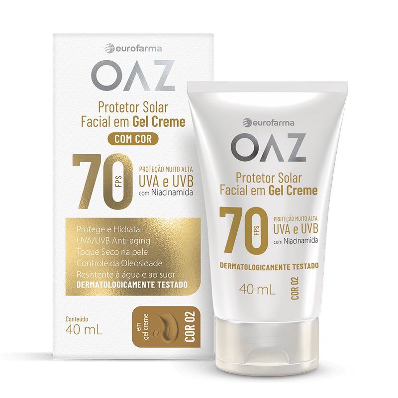 O OAZ Protetor Facial FPS 70 Cor 2 oferece alta proteção diária contra os raios UVA e UVB, ajudando a prevenir queimaduras solares, manchas e o envelhecimento precoce da pele. Com textura leve e toque seco, é ideal para uso diário, inclusive antes da maquiagem.