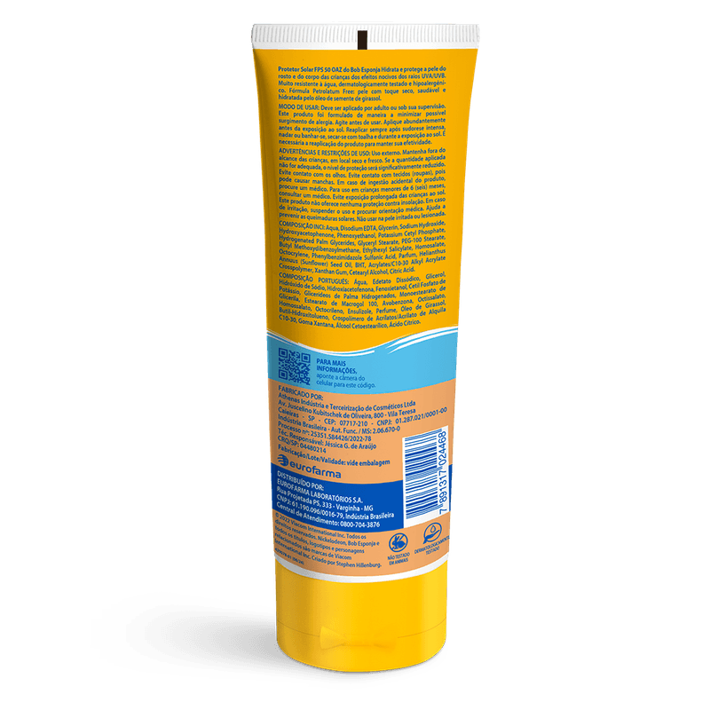 O protetor solar de 30 FPS em creme do Bob Esponja mantém o rosto e corpo das crianças hidratados e protegidos dos efeitos nocivos dos raios UVA/UVB. O produto é vegano e deixa a pele com toque seco. Sem adição de parabenos e dermatologicamente testado.