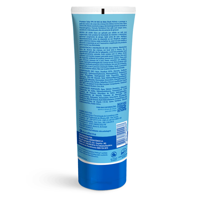 O protetor solar de 50 FPS em creme do Baby Shark mantém o rosto e corpo do seu bebê a partir de 6 meses hidratados e protegidos dos efeitos nocivos dos raios UVA/UVB. O produto é vegano e deixa a pele com toque seco. Sem adição de parabenos e dermatologicamente testado.