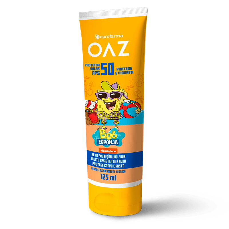 O protetor solar de 50 FPS em creme do Bob Esponja mantém o rosto e corpo das crianças hidratados e protegidos dos efeitos nocivos dos raios UVA/UVB. O produto é vegano e deixa a pele com toque seco. Sem adição de parabenos e dermatologicamente testado.