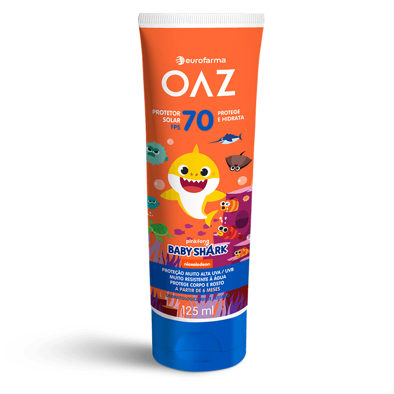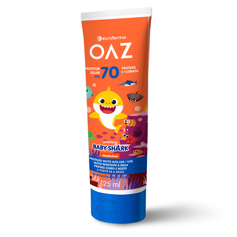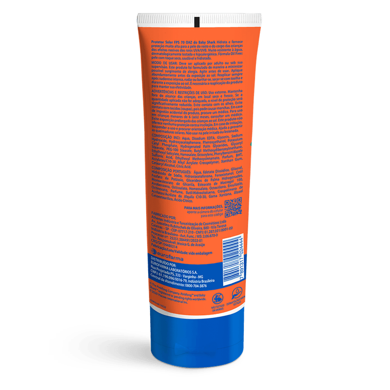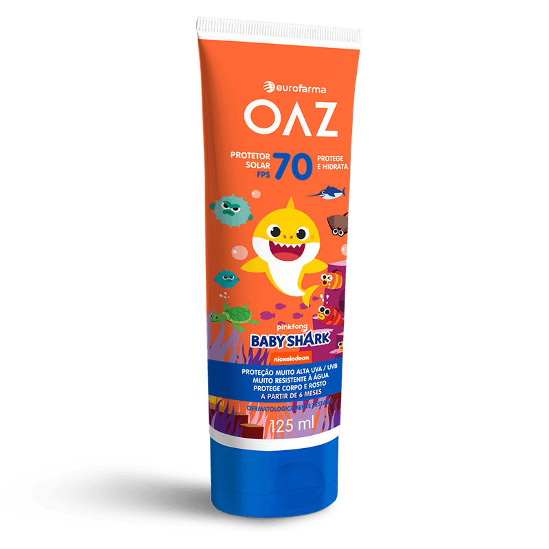 O protetor solar de 70 FPS em creme do Baby Shark mantém o rosto e corpo do seu bebê a partir de 6 meses hidratados e protegidos dos efeitos nocivos dos raios UVA/UVB. O produto é vegano e deixa a pele com toque seco. Sem adição de parabenos e dermatologicamente testado.