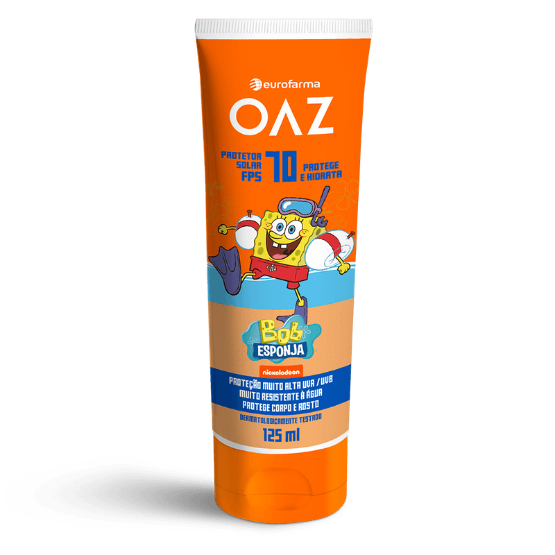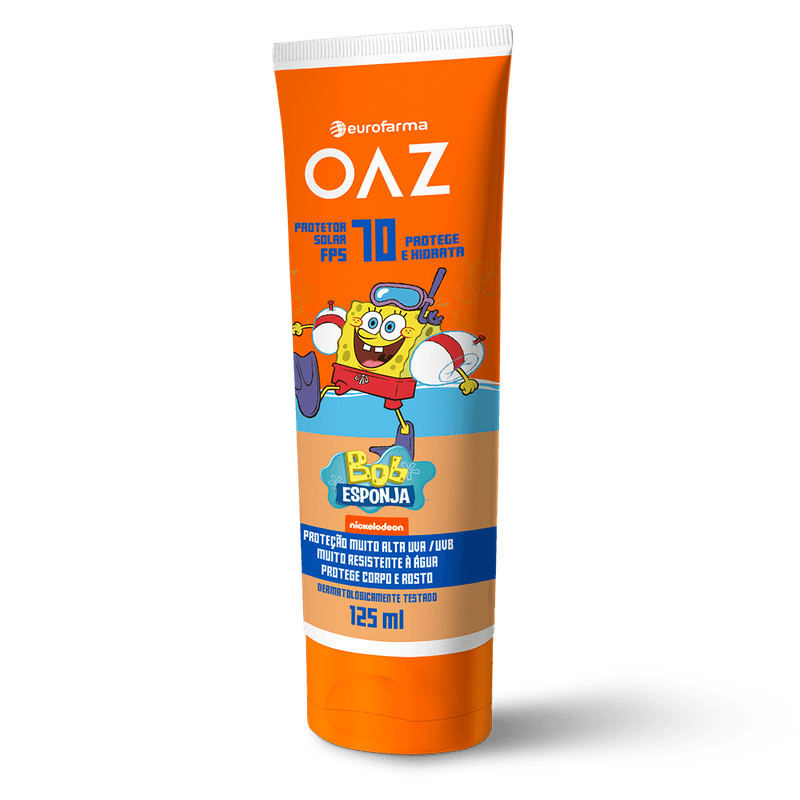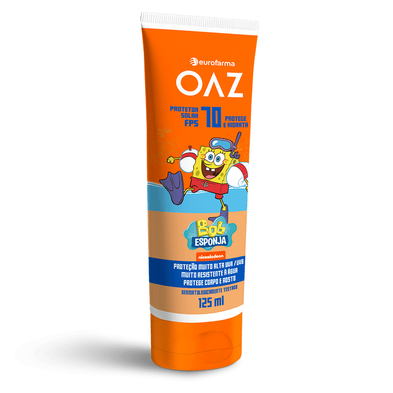O protetor solar de 70 FPS em creme do Bob Esponja mantém o rosto e corpo das crianças hidratados e protegidos dos efeitos nocivos dos raios UVA/UVB. O produto é vegano e deixa a pele com toque seco. Sem adição de parabenos e dermatologicamente testado.